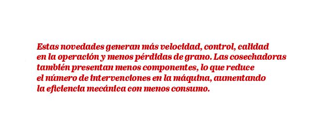 Con estas novedades, la máquina asume el mando de 9 controles que antes eran responsabilidad del operador. Ahora depende del operario elegir entre los modos Calidad de Granos, Desempeño Balanceado, Rendimiento Máximo y Rendimiento Fijo, y la máquina priorizará esta elección en su autorregulación. Para toda esta gestión, el Automation es capaz de proporcionar hasta 1.800 intervenciones diarias durante la operación de cosecha. En otras palabras, es la inteligencia artificial realizando la automatización de todo el equipo.