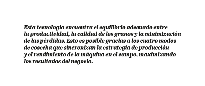 Los cuatro modos de cosecha proporcionan ajustes instantáneos que hacen que el proceso sea más fácil y menos complejo. Una vez calibrada, la máquina realiza una serie de análisis, como las condiciones del suelo y agronómicas, y realiza intervenciones hasta llegar al punto óptimo para esa situación a través de su sistema inteligente.